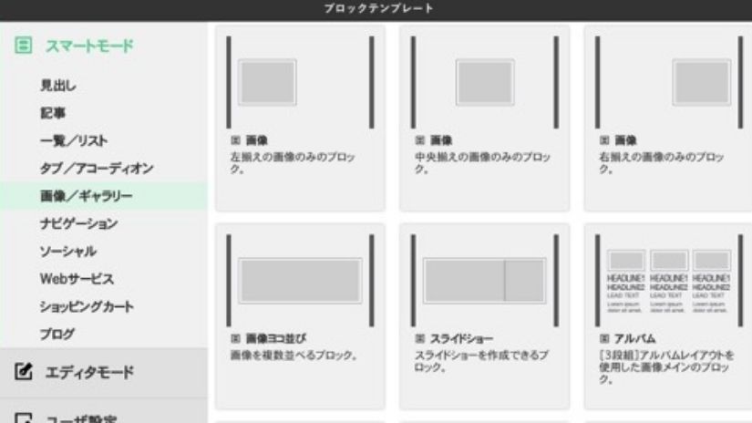ページテンプレートやパーツ(ブロック)毎のテンプレートをたくさんご用意しております。掲載内容に合わせてテンプレートを選んで、素材を差し替えるだけで新しいページを作成する事が出来ます。